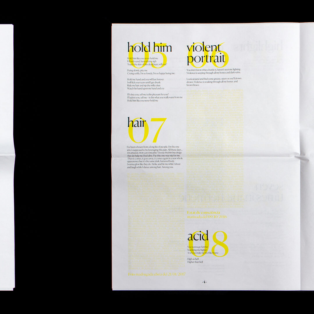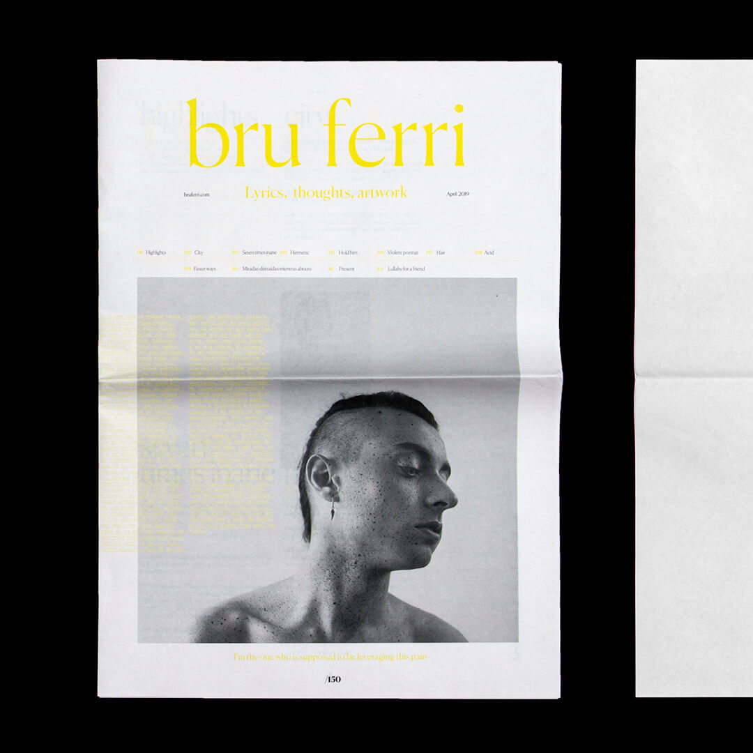 Bru Ferri's first album comes in newspaper format, packed with secret words printed in yellow almost-unreadable ink, lyrics and artwork. AD + Design. Photography Oriol Cervantes.